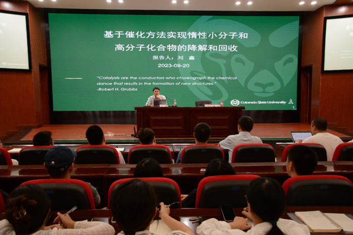 刘鑫介绍了基于催化方法实现惰性小分子和高分子化合物的降解与回收的研究进展,并结合自身和团队的研究成果,对有机光氧化还原催化活化C-F键的新催化剂研究、碳氟键活化、脱氟偶联反应、光催化羰基化反应、新型可回收聚合物、高通量和机器学习等内容做了精彩的报告。同时,刘鑫还分享了自己的学习经历,围绕做“有理想,有目标,有行动,有奋斗”的新时代青年与学弟学妹们进行互动交流。