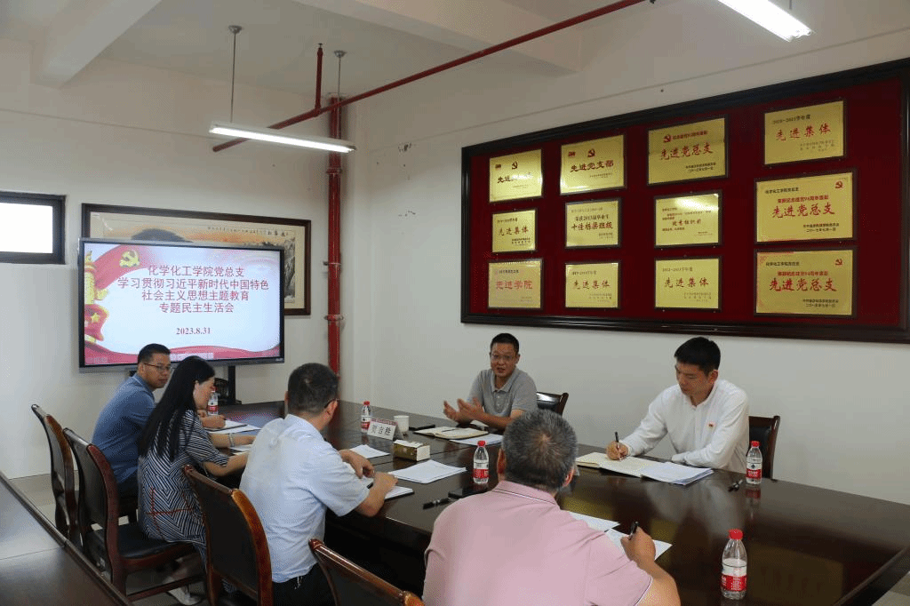 8月31日下午,化学化工学院党总支在笃行楼K1005会议室召开学习贯彻习近平新时代中国特色社会主义思想主题教育专题民主生活会。学校纪委书记贺吉胜列席会议并指导,学院全体班子成员参加会议,学校纪检监察相关工作人员列席会议。