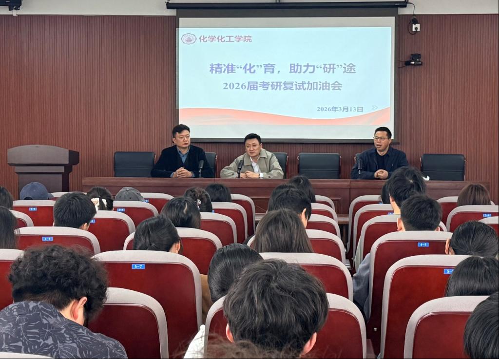 为筑牢考研学子复试冲刺信心、提升复试成功率,3月13日上午,化学化工学院在K1020召开了2026届考研复试加油会。学院党总支书记杨睿宇、副院长邱会东、党总支副书记田勤思出席会议并作动员指导,毕业班辅导员及考研初试超过国家线的学生参会。