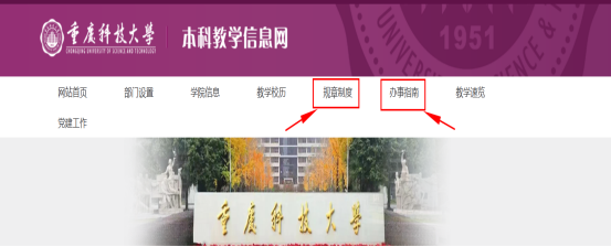 学校通过本科教学信息网(网址:https://jw.cqust.edu.cn)“规章制度”栏目发布与更新本科教学管理规范文件,“办事指南”栏目同步更新本科教学业务办理流程及相关表格、模板。请全院师生规范使用,操作指南见附件。