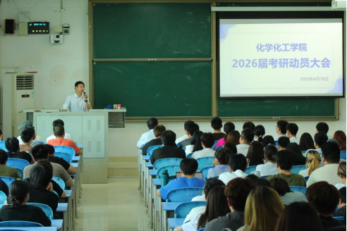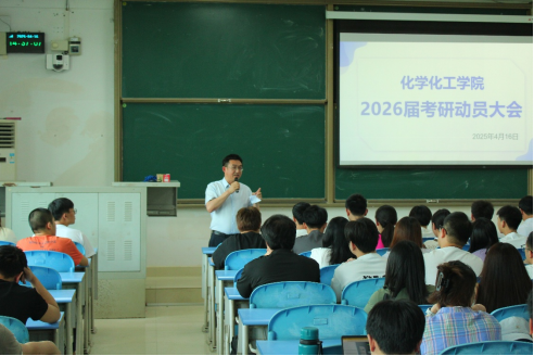 为进一步激发学院学子考研热情,不断注入奋进力量,4月16日下午,化学化工学院组织开展2026届考研动员会。学院学术院长熊伟、党总支副书记周骏、2022级学生辅导员、2021级考研学生代表及200余名2022级备考学生齐聚一堂,共话考研征程。