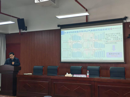 报告中,余波博士介绍了其课题组在针对氟离子水体污染及硫化氢气体治理需求的镁基、铝基与铁基三类环境功能材料的设计与性能优化方面的研究情况。内容包括通过水热法、煅烧及负载改性等可控合成策略,精准调控材料孔结构与表面活性位点,可显著提升材料对F-和H2S的吸附容量与循环稳定性;利用多种表征技术和吸附模型,证明材料对F-和H2S的吸附机制主要通过表面配位、离子交换等;为高性能环境修复材料的开发提供理论支撑与技术路径。现场师生就材料设计制备、机制探究和实际应用等问题展开交流。参会师生踊跃提问、积极互动,现场学术讨论热烈。此次报告紧扣研究前沿,既展现了镁基、铝基与铁基环境功能材料的独特优势和应用价值,又有效开阔了师生科学视野,对我院青年教师和研究生开展科学研究提供了新的思路。