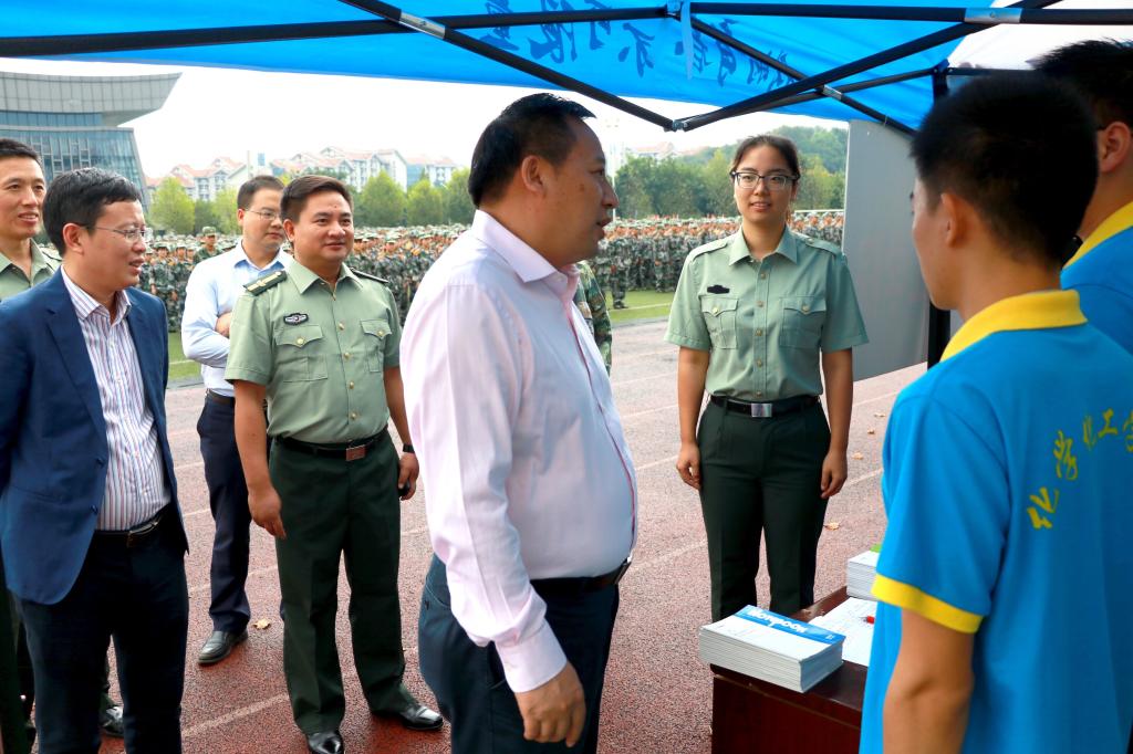 【团总支学生分会信息部】9月12日下午,校党委书记刘东燕在学工部部长张琪及军训团各职能部门领导的陪同下,看望2018届的军训官兵。我院所在五营列队接受军姿检阅。