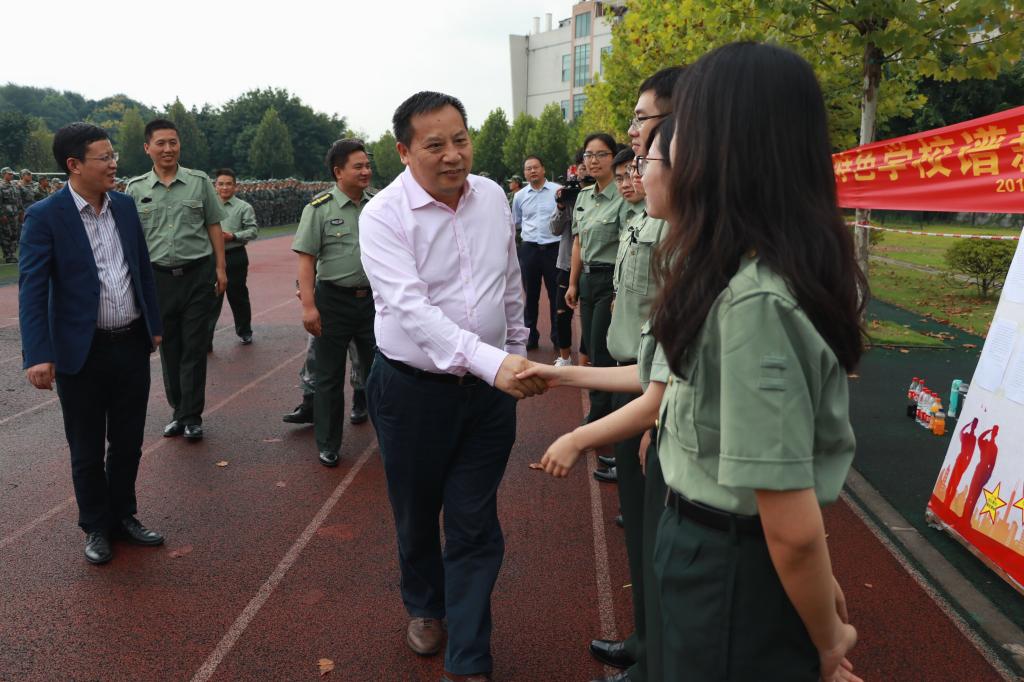 一行行整齐的队伍,一寸寸坚定的目光,新生们昂首挺胸,不畏风雨,自信从容地接受校领导的检阅。我院教导员韩冰老师、5位连队指导员及服务的学生干部也对领导的到来表示热烈欢迎。韩冰老师学院的军训工作向刘东燕书记做了简单汇报。刘书记听取报告后,亲切地同5位连队指导员握手问好,以表慰问之情。